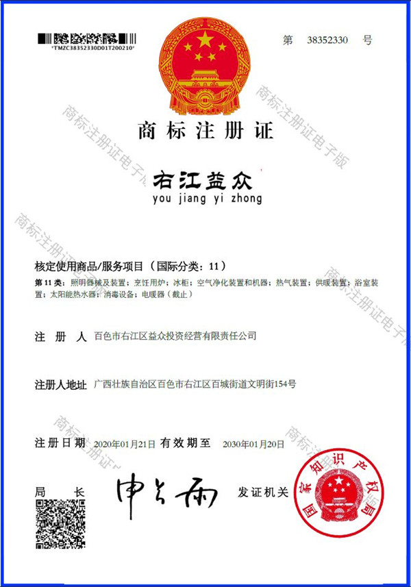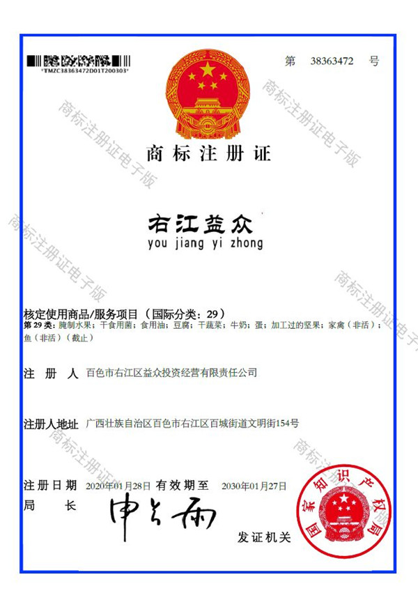 2019年4月,為樹立企業(yè)品牌形象,充分展現(xiàn)品牌價值,廣西百色益眾投資有限公司按照建設(shè)現(xiàn)代企業(yè)的方向和標準,啟動品牌商標注冊申報工作,經(jīng)過6個月的審核期和3個月的公告期,“右江益眾”45個大類商標品牌第一時間成功獲批?!坝医姹姟逼放频某晒ψ裕欣诠靖玫貐⑴c市場競爭,同時,對于強化企業(yè)內(nèi)部管理、樹立良好的企業(yè)形象、提升公司美譽度也可起到積極的助推作用。