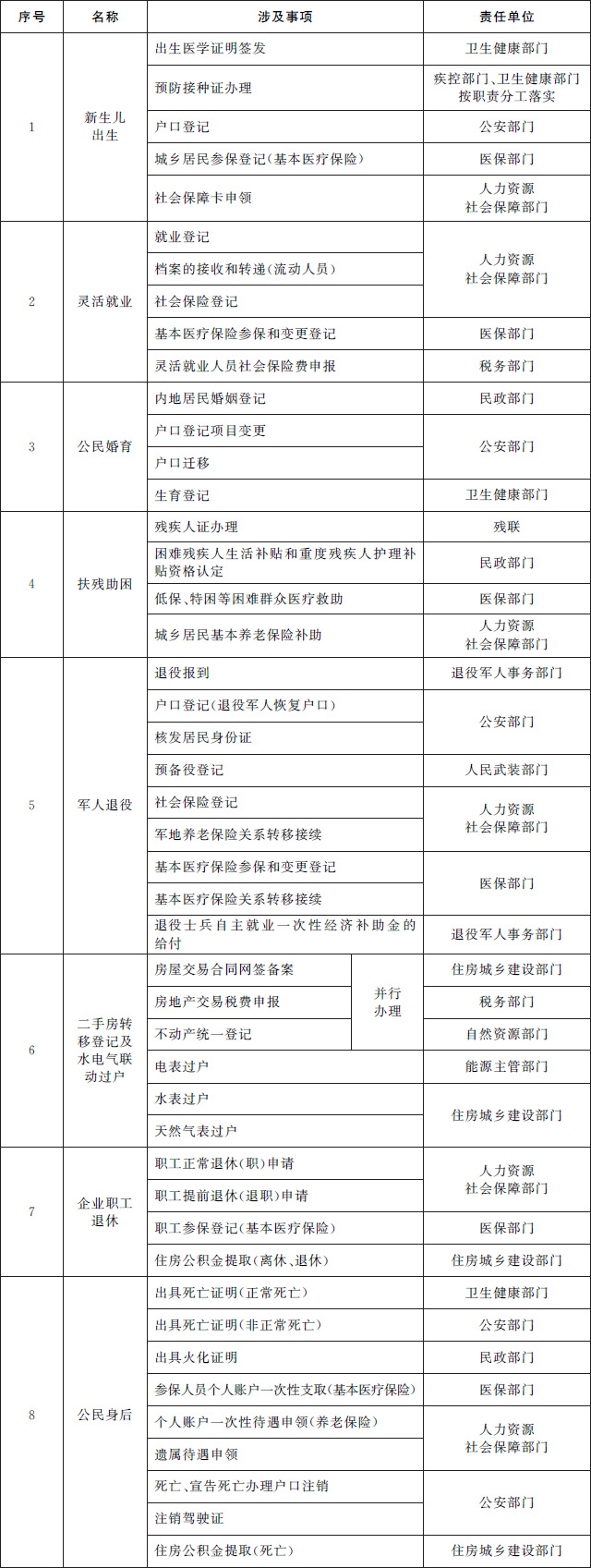 (二)推進(jìn)個(gè)人全生命周期相關(guān)政務(wù)服務(wù)事項(xiàng)“一件事一次辦”。圍繞個(gè)人從出生到身后全生命周期的重要階段,梳理集成同一階段內(nèi)需要辦理的多個(gè)單一政務(wù)服務(wù)事項(xiàng),為群眾提供新生兒出生、入園入學(xué)、大中專(zhuān)學(xué)生畢業(yè)、就業(yè)、就醫(yī)、婚育、扶殘助困、軍人退役、二手房交易及水電氣聯(lián)動(dòng)過(guò)戶、退休、身后等集成化辦理服務(wù),切實(shí)提升群眾辦事便捷度,減少跑動(dòng)次數(shù)。