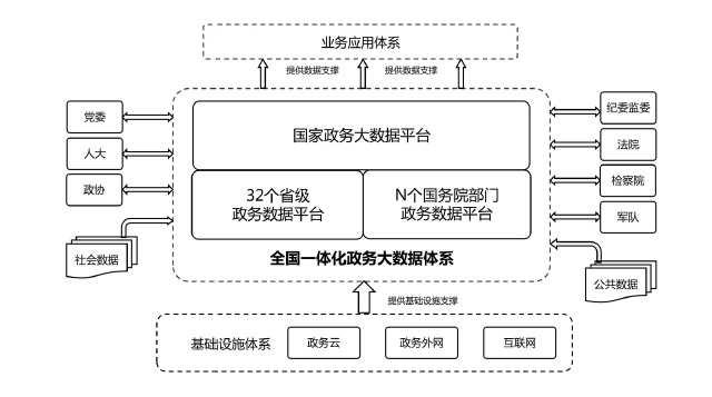 全國(guó)一體化政務(wù)大數(shù)據(jù)體系包括三類平臺(tái)和三大支撐。三類平臺(tái)為“1+32+N”框架結(jié)構(gòu)。“1”是指國(guó)家政務(wù)大數(shù)據(jù)平臺(tái),是我國(guó)政務(wù)數(shù)據(jù)管理的總樞紐、政務(wù)數(shù)據(jù)流轉(zhuǎn)的總通道、政務(wù)數(shù)據(jù)服務(wù)的總門戶;“32”是指31個(gè)省(自治區(qū)、直轄市)和新疆生產(chǎn)建設(shè)兵團(tuán)統(tǒng)籌建設(shè)的省級(jí)政務(wù)數(shù)據(jù)平臺(tái),負(fù)責(zé)本地區(qū)政務(wù)數(shù)據(jù)的目錄編制、供需對(duì)接、匯聚整合、共享開(kāi)放,與國(guó)家平臺(tái)實(shí)現(xiàn)級(jí)聯(lián)對(duì)接;“N”是指國(guó)務(wù)院有關(guān)部門的政務(wù)數(shù)據(jù)平臺(tái),負(fù)責(zé)本部門本行業(yè)數(shù)據(jù)匯聚整合與供需對(duì)接,與國(guó)家平臺(tái)實(shí)現(xiàn)互聯(lián)互通,尚未建設(shè)政務(wù)數(shù)據(jù)平臺(tái)的部門,可由國(guó)家平臺(tái)提供服務(wù)支撐。三大支撐包括管理機(jī)制、標(biāo)準(zhǔn)規(guī)范、安全保障三個(gè)方面。