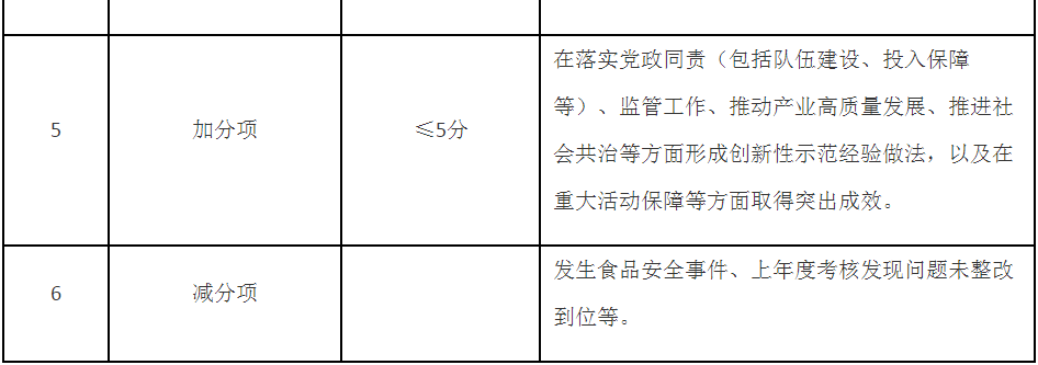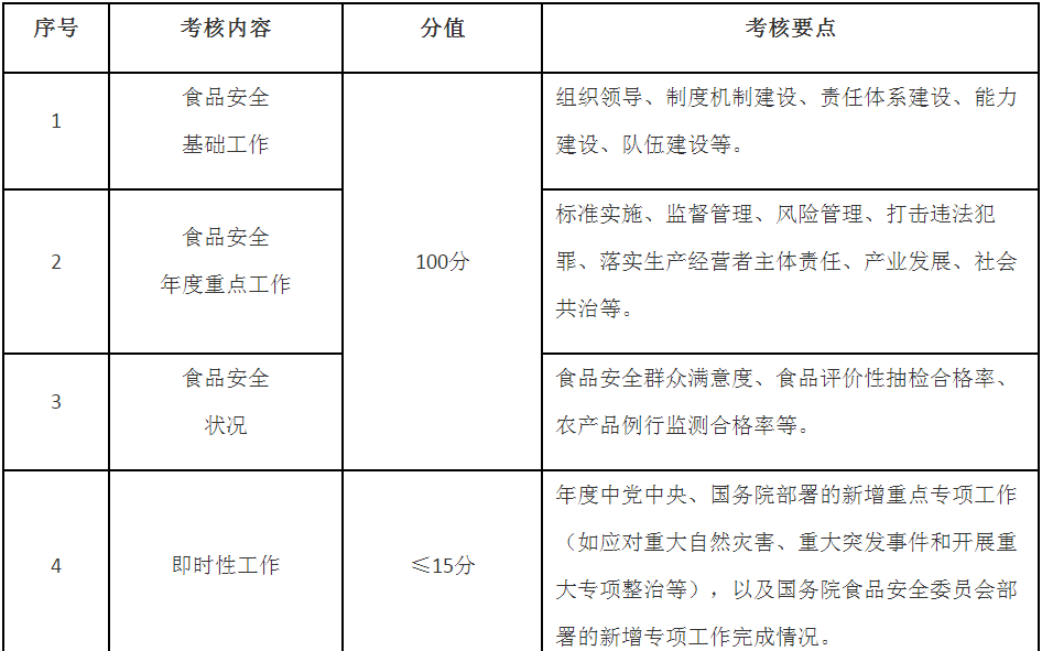 第五條 考核內(nèi)容主要包括食品安全基礎(chǔ)工作推進(jìn)、年度重點(diǎn)工作落實(shí)、食品安全狀況等,同時(shí)設(shè)置即時(shí)性工作評(píng)價(jià)和加減分項(xiàng)(考核內(nèi)容要點(diǎn)見附件)。具體考核指標(biāo)及分值在年度食品安全工作考核方案及其細(xì)則中明確,設(shè)置要科學(xué)合理,可操作、可評(píng)價(jià)、可區(qū)分,切實(shí)減輕基層負(fù)擔(dān)。