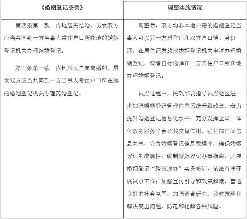 國務院決定在內地居民婚姻登記“跨省通辦”試點地區(qū)暫時調整實施《婚姻登記條例》有關規(guī)定目錄