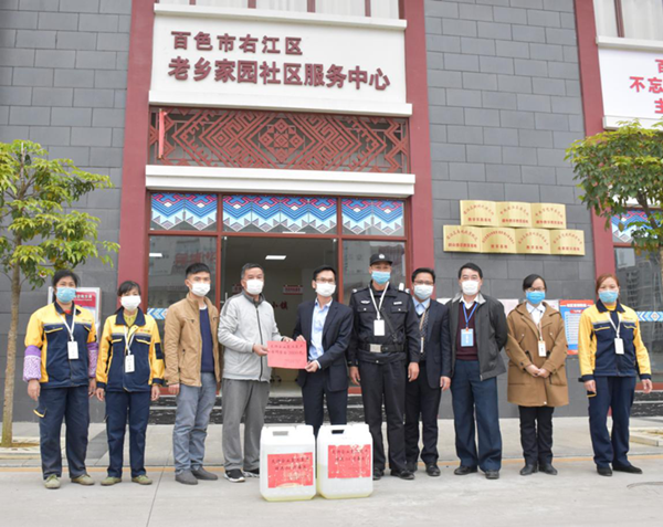 右江區(qū)總工會領導向老鄉(xiāng)家園-迎龍安置小鎮(zhèn)服務企業(yè)益眾物業(yè)公司捐贈防疫物資
