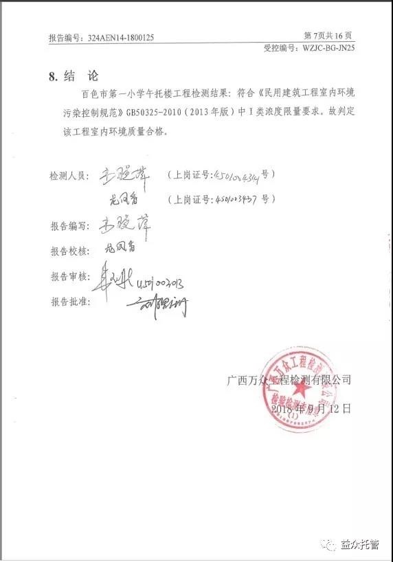 2??018年9月27日,廣西萬(wàn)眾工程檢測(cè)有限公司提交了檢測(cè)報(bào)告,新托管樓室內(nèi)、室外檢測(cè)點(diǎn)甲醛、氨、苯、TVOC、氡濃度指標(biāo)均符合《民用建筑工程室內(nèi)環(huán)境污染控制規(guī)范》GB50325-2010(2013年版)中I類濃度限量要求,室內(nèi)環(huán)境質(zhì)量合格。