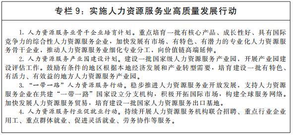 加快人力資源服務(wù)業(yè)高質(zhì)量發(fā)展。推動人力資源服務(wù)與實體經(jīng)濟融合發(fā)展,引導(dǎo)人力資源服務(wù)機構(gòu)圍繞產(chǎn)業(yè)基礎(chǔ)高級化、產(chǎn)業(yè)鏈現(xiàn)代化提供精準專業(yè)服務(wù)。鼓勵人力資源服務(wù)業(yè)管理創(chuàng)新、技術(shù)創(chuàng)新、服務(wù)創(chuàng)新和產(chǎn)品創(chuàng)新,大力發(fā)展人力資源管理咨詢、高級人才尋訪、人才測評等高技術(shù)、高附加值業(yè)態(tài)。實施人力資源服務(wù)業(yè)領(lǐng)軍人才培養(yǎng)計劃。開展“互聯(lián)網(wǎng)+人力資源服務(wù)”行動。深化人力資源服務(wù)領(lǐng)域?qū)ν忾_放,探索建設(shè)國家人力資源服務(wù)出口基地。