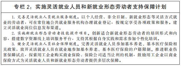 支持多渠道靈活就業(yè)和新就業(yè)形態(tài)發(fā)展。破除各種不合理限制,建立促進多渠道靈活就業(yè)機制,支持和規(guī)范發(fā)展新就業(yè)形態(tài)。鼓勵傳統(tǒng)行業(yè)跨界融合、業(yè)態(tài)創(chuàng)新,增加靈活就業(yè)和新就業(yè)形態(tài)就業(yè)機會。加快落實《關(guān)于維護新就業(yè)形態(tài)勞動者勞動保障權(quán)益的指導(dǎo)意見》,建立完善適應(yīng)靈活就業(yè)和新就業(yè)形態(tài)的勞動權(quán)益保障制度,引導(dǎo)支持靈活就業(yè)人員和新就業(yè)形態(tài)勞動者參加社會保險,提高靈活就業(yè)人員和新就業(yè)形態(tài)勞動者社會保障水平。規(guī)范平臺企業(yè)用工,明確平臺企業(yè)勞動保護責(zé)任。健全職業(yè)分類動態(tài)調(diào)整機制,持續(xù)開發(fā)新職業(yè),發(fā)布新職業(yè)標準。