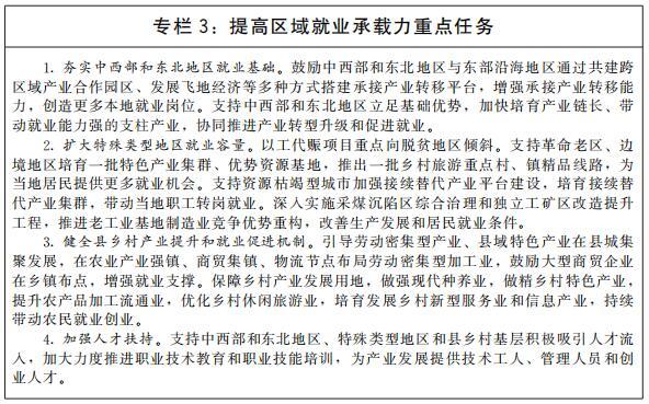 推動區(qū)域就業(yè)協(xié)調(diào)發(fā)展。支持東部地區(qū)發(fā)揮創(chuàng)新要素集聚優(yōu)勢,率先實現(xiàn)產(chǎn)業(yè)升級,開拓高質(zhì)量就業(yè)新領(lǐng)域,培育高質(zhì)量就業(yè)增長極。加快完善中西部和東北地區(qū)基礎(chǔ)設(shè)施,提升產(chǎn)業(yè)集聚區(qū)公共服務(wù)效能,引導(dǎo)產(chǎn)業(yè)向中西部和東北地區(qū)有序梯度轉(zhuǎn)移,推動就業(yè)機會向中西部和東北地區(qū)擴散。支持中西部和東北地區(qū)根據(jù)國家戰(zhàn)略導(dǎo)向和發(fā)展重點,對接先進生產(chǎn)要素和創(chuàng)新資源,發(fā)展特色優(yōu)勢產(chǎn)業(yè),改造提升傳統(tǒng)產(chǎn)業(yè),積極布局新興產(chǎn)業(yè),厚植就業(yè)創(chuàng)業(yè)沃土。