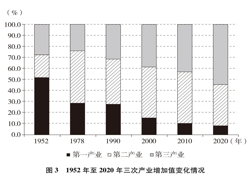 產(chǎn)業(yè)結(jié)構(gòu)優(yōu)化升級(jí)。中國(guó)已建成世界上最完整的產(chǎn)業(yè)體系,產(chǎn)業(yè)發(fā)展持續(xù)向中高端邁進(jìn)。三次產(chǎn)業(yè)增加值之比從1952年的50.5∶20.8∶28.7到2020年的7.7∶37.8∶54.5,中國(guó)從傳統(tǒng)農(nóng)業(yè)大國(guó)成為工業(yè)大國(guó)、服務(wù)業(yè)大國(guó)(圖3),中國(guó)經(jīng)濟(jì)從依賴(lài)單一產(chǎn)業(yè)為主轉(zhuǎn)向依靠三次產(chǎn)業(yè)共同帶動(dòng)。農(nóng)業(yè)現(xiàn)代化成效顯著,機(jī)械化、數(shù)字化、綠色化、功能化、共享化水平明顯提高,廣大農(nóng)民逐步告別“面朝黃土背朝天、一身力氣百身汗”的辛勞,農(nóng)村生產(chǎn)力極大解放;糧食生產(chǎn)能力穩(wěn)步提升,實(shí)現(xiàn)谷物基本自給,中國(guó)人把飯碗牢牢端在自己手中。中國(guó)建成門(mén)類(lèi)齊全、獨(dú)立完整的現(xiàn)代工業(yè)體系,工業(yè)化和信息化融合發(fā)展的廣度和深度不斷拓展,“中國(guó)制造”向“中國(guó)智造”轉(zhuǎn)型升級(jí),產(chǎn)業(yè)鏈供應(yīng)鏈現(xiàn)代化水平進(jìn)一步提升。以新一代信息技術(shù)、生物技術(shù)、高端裝備、綠色環(huán)保為代表的戰(zhàn)略性新興產(chǎn)業(yè)發(fā)展迅速,成為引領(lǐng)高質(zhì)量發(fā)展的重要引擎。數(shù)字經(jīng)濟(jì)激發(fā)經(jīng)濟(jì)發(fā)展新活力,產(chǎn)業(yè)數(shù)字化和數(shù)字產(chǎn)業(yè)化趨勢(shì)加快?,F(xiàn)代服務(wù)業(yè)加速發(fā)展,以“互聯(lián)網(wǎng)+”為標(biāo)志的新業(yè)態(tài)、新模式層出不窮,平臺(tái)經(jīng)濟(jì)、共享經(jīng)濟(jì)蓬勃興起,生產(chǎn)性服務(wù)業(yè)向?qū)I(yè)化和高端化發(fā)展,生活性服務(wù)業(yè)向精細(xì)化和高品質(zhì)轉(zhuǎn)變。產(chǎn)業(yè)結(jié)構(gòu)的優(yōu)化升級(jí)促進(jìn)了經(jīng)濟(jì)更加均衡、更加充分的發(fā)展,人們個(gè)性化品質(zhì)化多樣化需求不斷得到滿足。