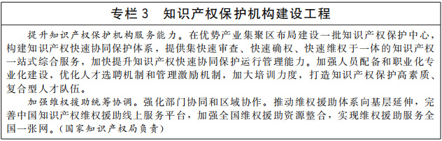 健全知識產權行政保護機制。加強中央在知識產權保護的宏觀管理、區(qū)域協(xié)調和涉外事宜統(tǒng)籌等方面事權。加強知識產權快保護機構建設。在條件成熟的地區(qū)建設國家知識產權保護試點示范區(qū)。加強知識產權行政執(zhí)法指導制度建設。建立行政保護技術調查官制度。健全知識產權侵權糾紛行政裁決制度。健全跨區(qū)域、跨部門知識產權行政保護協(xié)作機制。加強商貿流通領域知識產權保護,制定商品交易市場知識產權保護國家規(guī)范,持續(xù)推進知識產權保護規(guī)范化市場建設,凈化消費市場。(國家知識產權局牽頭,中央宣傳部、文化和旅游部、市場監(jiān)管總局等按職責分工負責)