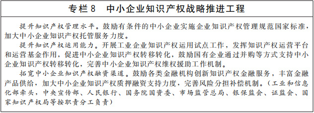 積極穩(wěn)妥發(fā)展知識產權金融。優(yōu)化知識產權質押融資體系,健全知識產權質押融資風險管理機制,完善質物處置機制,建設知識產權質押信息平臺。支持銀行創(chuàng)新內部考核管理模式,推動銀行業(yè)金融機構用好單列信貸計劃和優(yōu)化不良率考核等監(jiān)管政策,在風險可控的前提下擴大知識產權質押貸款規(guī)模。鼓勵知識產權保險、信用擔保等金融產品創(chuàng)新,充分發(fā)揮金融支持知識產權轉化的作用。在自由貿易試驗區(qū)和自由貿易港推進知識產權金融服務創(chuàng)新。健全知識產權價值評估體系,鼓勵開發(fā)智能化知識產權評估工具。(國家知識產權局牽頭,中央宣傳部、國家發(fā)展改革委、財政部、人民銀行、銀保監(jiān)會、證監(jiān)會等按職責分工負責)