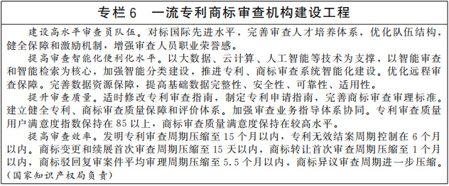 提高知識產權審查質量和審查效率。完善適應創(chuàng)新發(fā)展需求的知識產權審查管理體系,優(yōu)化專利、商標審查協(xié)作機制。提升專利商標審查機構能力水平,強化專利、商標、版權、地理標志、植物新品種全流程審查質量管控,提升知識產權授權確權質量。提高專利、商標審查業(yè)務精細化管理水平,優(yōu)化審查資源配置,加強智能化技術運用,提升審查效能,縮短審查周期。完善專利、商標審查模式,加強審查與產業(yè)發(fā)展的政策協(xié)同和業(yè)務聯(lián)動,滿足產業(yè)綠色轉型和新領域新業(yè)態(tài)創(chuàng)新發(fā)展等社會多樣化需求。(中央宣傳部、工業(yè)和信息化部、農業(yè)農村部、國家林草局、國家知識產權局等按職責分工負責)
