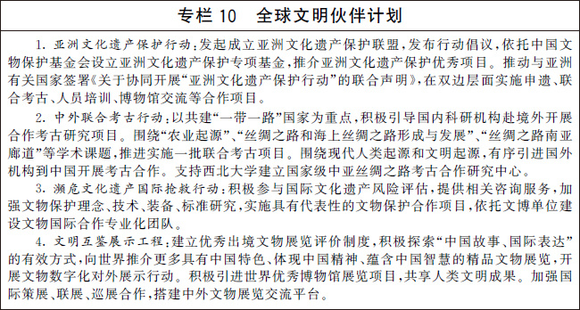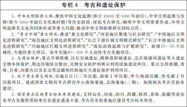 編制并實施“十四五”考古工作專項規(guī)劃。系統(tǒng)確定考古發(fā)掘重點,深化中華文明探源工程,推進“考古中國”重大項目,科學闡釋中國境內(nèi)人類起源、文明起源、中華文明形成、統(tǒng)一多民族國家建立和發(fā)展、中華文明在世界文明史中的重要地位等關(guān)鍵問題,揭示中華文明的歷史文化價值和核心特質(zhì)。