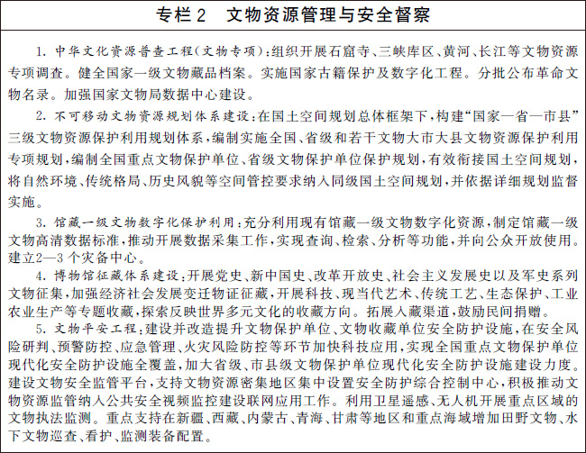 實施文物平安工程,加大古遺址、古墓葬、石窟寺石刻等防盜竊盜掘預警技術(shù)研發(fā)應用和相關(guān)裝備配置力度。加強博物館和文物建筑等火災防控、洪澇監(jiān)測預警、地震和地質(zhì)災害防控信息技術(shù)應用和應急管理體系建設。加強衛(wèi)星遙感、無人機、大數(shù)據(jù)等科技手段在文物安全監(jiān)測和執(zhí)法督察中的應用。