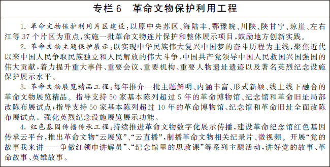 整合文物、黨史、軍史、檔案、地方志等方面研究力量,加強革命文物保護利用研究,開展實物、文獻、檔案、史料和口述史征集,挖掘革命文物深刻內(nèi)涵,推出重要研究成果,旗幟鮮明反對和抵制歷史虛無主義,繼續(xù)發(fā)揚偉大建黨精神,傳承弘揚井岡山精神、長征精神、遵義會議精神、延安精神、西柏坡精神、紅巖精神、抗美援朝精神、“兩彈一星”精神、特區(qū)精神、抗洪精神、抗震救災精神、抗疫精神、脫貧攻堅精神等偉大精神。