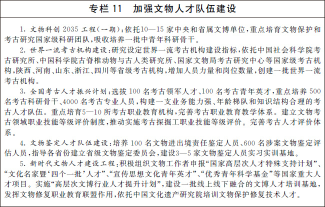 培育一批以領軍人才和中青年骨干創(chuàng)新人才為重點的高層次文物人才,加強考古、科技創(chuàng)新、文物鑒定、文物修復、文物展覽等急需領域人才培養(yǎng),加快建設一支門類齊全、技藝精湛的文物技能人才隊伍,穩(wěn)步造就一支科技研發(fā)能力和技術(shù)應用能力過硬的文物科技人才隊伍,錘煉一支熟悉專業(yè)、素質(zhì)優(yōu)良的文物管理人才隊伍。加強相關(guān)行業(yè)文物保護人才培養(yǎng)。