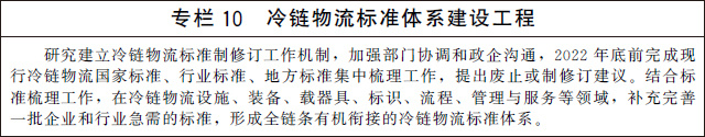 加強冷鏈物流標準制修訂。加強冷鏈基礎通用標準和冷鏈基礎設施、技術裝備、作業(yè)流程、信息追溯等重點環(huán)節(jié)以及冷鏈物流綠色化、智慧化等重點領域標準制修訂,加快填補標準空白。制定一批強制性國家標準,守好冷鏈產(chǎn)品安全底線。加強冷鏈物流推薦性國家標準、行業(yè)標準推陳出新,支持地方因地制宜制定符合發(fā)展需要的地方標準,鼓勵高起點制定團體標準和企業(yè)標準。積極參與冷鏈物流國際標準化活動,推動國內(nèi)國際標準接軌。
