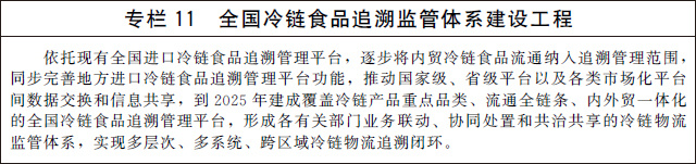 加快建設全國性冷鏈物流追溯監(jiān)管平臺,完善全鏈條監(jiān)管機制,針對冷鏈物流環(huán)境、主要作業(yè)環(huán)節(jié)、設施設備管理等重點,規(guī)范實時監(jiān)測、及時處置、評估反饋等監(jiān)管過程,逐步分類實現(xiàn)全程可視可控、可溯源、可追查。創(chuàng)新監(jiān)管手段,加大現(xiàn)代信息技術和設施設備應用力度,強化現(xiàn)場和非現(xiàn)場監(jiān)管方式有機結(jié)合。借鑒新冠肺炎疫情防控期間進口冷鏈食品檢驗檢測檢疫經(jīng)驗做法,優(yōu)化完善工作機制,建立科學、可靠、高效的冷鏈物流檢驗檢測檢疫體系。
