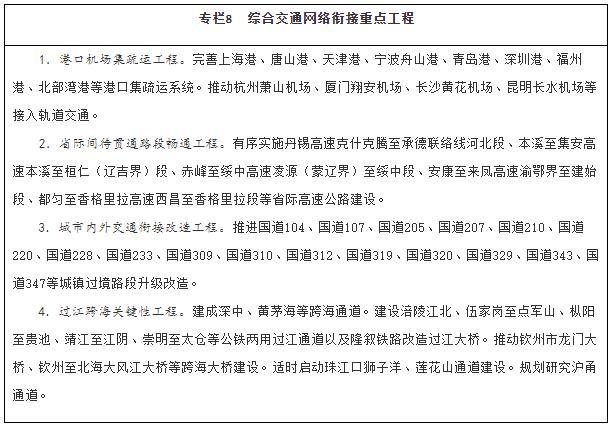 加快解決制約人民美好出行、貨物高效流通的瓶頸,強(qiáng)化綜合交通網(wǎng)絡(luò)有機(jī)銜接。打通公路省際待貫通路段,加強(qiáng)干線公路與城市道路有效銜接,推進(jìn)城鎮(zhèn)密集地區(qū)干線公路過境段、進(jìn)出城瓶頸路段升級改造。加強(qiáng)樞紐機(jī)場與軌道交通高效銜接,使換乘更加便捷。強(qiáng)化進(jìn)港區(qū)、進(jìn)園區(qū)、進(jìn)廠區(qū)、進(jìn)規(guī)?;r(nóng)產(chǎn)品基地等集疏運(yùn)設(shè)施建設(shè),加快推動(dòng)鐵路進(jìn)港口重點(diǎn)港區(qū)和大型工礦企業(yè)、物流園區(qū)、重點(diǎn)物資儲備庫。統(tǒng)籌考慮資源高效利用、生態(tài)環(huán)境保護(hù)和防洪航運(yùn)安全,有序建設(shè)各種運(yùn)輸方式共享通道資源的過江跨海通道。推動(dòng)超大特大城市的大型綜合客運(yùn)樞紐間通過軌道交通互連。加快實(shí)現(xiàn)聯(lián)系緊密的綜合貨運(yùn)樞紐間通過聯(lián)絡(luò)線或?qū)S猛ǖ阑ミB。