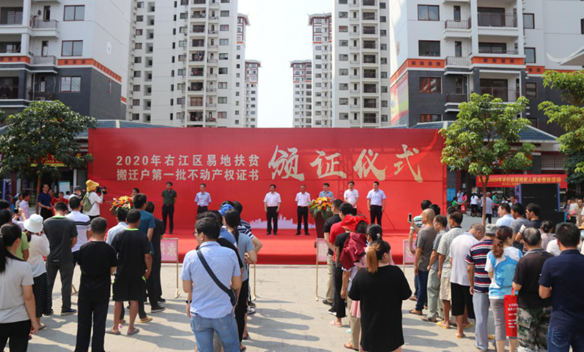 5月16日上午,右江區(qū)“老鄉(xiāng)家園—迎龍易地扶貧搬遷安置小鎮(zhèn)”搬遷戶不動(dòng)產(chǎn)權(quán)證書頒證儀式在安置小鎮(zhèn)舉行,第一批26戶搬遷戶順利拿到了產(chǎn)權(quán)證書。百色市發(fā)改委副主任、市水庫(kù)和扶貧易地安置管理局局長(zhǎng)羅加攀,右江區(qū)委常委、區(qū)人民政府副區(qū)長(zhǎng)岑萬興,右江區(qū)委常委、宣傳部部長(zhǎng)、區(qū)人民政府副區(qū)長(zhǎng)王世凡,右江區(qū)委常委、辦公室主任盧靈及右江區(qū)直單位、鄉(xiāng)鎮(zhèn)代表,廣西百色益眾投資有限公司董事長(zhǎng)、總經(jīng)理趙家臣出席儀式。儀式由王世凡主持。