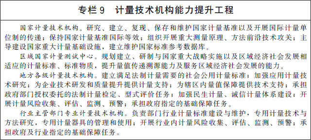 (二十一)加快計(jì)量技術(shù)機(jī)構(gòu)建設(shè)。深化計(jì)量技術(shù)機(jī)構(gòu)改革創(chuàng)新發(fā)展,優(yōu)化整合國(guó)家計(jì)量技術(shù)機(jī)構(gòu)、區(qū)域國(guó)家計(jì)量測(cè)試中心、地方各級(jí)計(jì)量技術(shù)機(jī)構(gòu)和行業(yè)主管部門專業(yè)計(jì)量技術(shù)機(jī)構(gòu)。大力推動(dòng)國(guó)家計(jì)量技術(shù)機(jī)構(gòu)創(chuàng)新發(fā)展,通過(guò)組織開(kāi)展重大測(cè)量原理、方法前沿技術(shù)攻關(guān),建立量子計(jì)量基準(zhǔn)并保持國(guó)際等效,提供一流的量值溯源和測(cè)量服務(wù),支撐國(guó)家科技創(chuàng)新、工業(yè)競(jìng)爭(zhēng)力提升和經(jīng)濟(jì)社會(huì)發(fā)展。充分發(fā)揮省級(jí)人民政府和行業(yè)主管部門計(jì)量基礎(chǔ)設(shè)施規(guī)劃建設(shè)自主權(quán),加強(qiáng)普惠性、基礎(chǔ)性和公益性計(jì)量基礎(chǔ)設(shè)施建設(shè)。提升計(jì)量技術(shù)機(jī)構(gòu)服務(wù)市場(chǎng)的能力和水平,推動(dòng)形成一批專業(yè)領(lǐng)域服務(wù)平臺(tái),培育一批專業(yè)化、社會(huì)化、網(wǎng)絡(luò)化的服務(wù)機(jī)構(gòu),為經(jīng)濟(jì)社會(huì)發(fā)展和行業(yè)創(chuàng)新提供計(jì)量測(cè)試服務(wù)。
